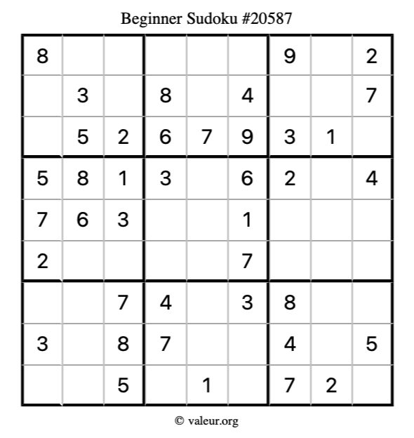 Here is our printable Beginner Sudoku Puzzle #20587. You are welcome to print a copy for yourself and solve it the old-fashioned way with a pencil and an eraser!