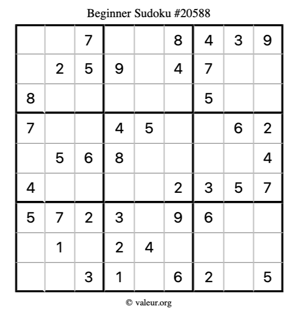 Here is our printable Beginner Sudoku Puzzle #20588. You are welcome to print a copy for yourself and solve it the old-fashioned way with a pencil and an eraser!