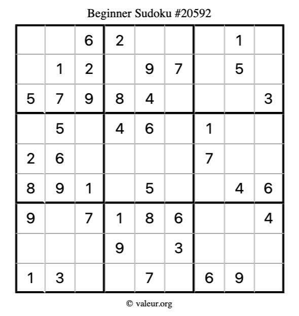 Here is our printable Beginner Sudoku Puzzle #20592. You are welcome to print a copy for yourself and solve it the old-fashioned way with a pencil and an eraser!