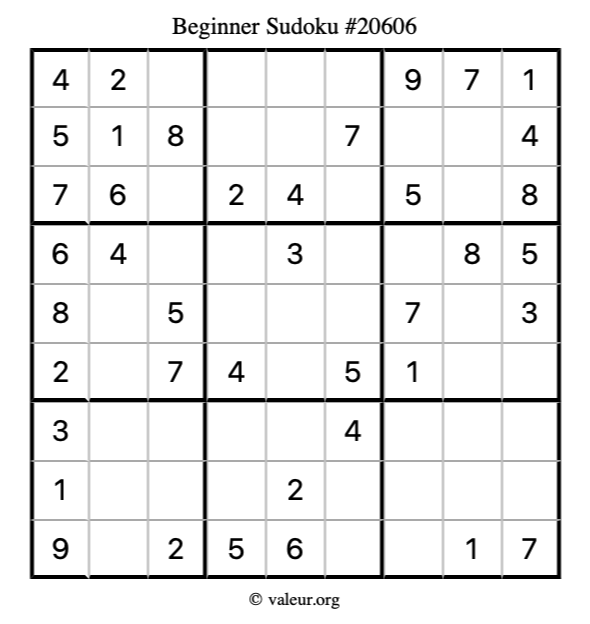 Here is our printable Beginner Sudoku Puzzle #20606. You are welcome to print a copy for yourself and solve it the old-fashioned way with a pencil and an eraser!