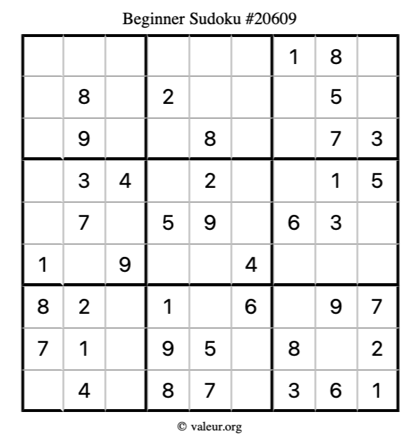 Here is our printable Beginner Sudoku Puzzle #20609. You are welcome to print a copy for yourself and solve it the old-fashioned way with a pencil and an eraser!