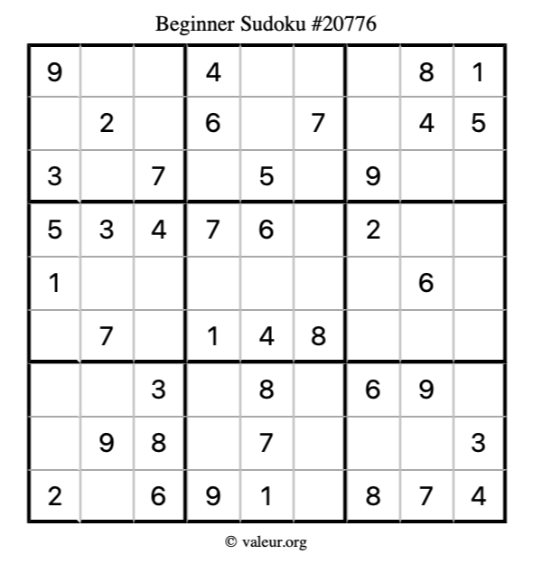 Here is our printable Beginner Sudoku Puzzle #20776. You are welcome to print a copy for yourself and solve it the old-fashioned way with a pencil and an eraser!