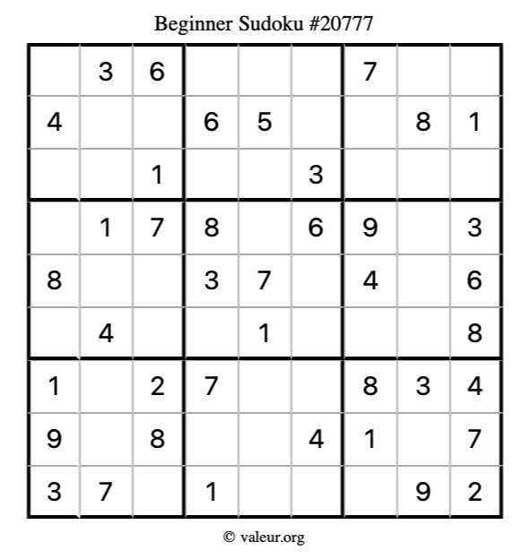 Here is our printable Beginner Sudoku Puzzle #20777. You are welcome to print a copy for yourself and solve it the old-fashioned way with a pencil and an eraser!