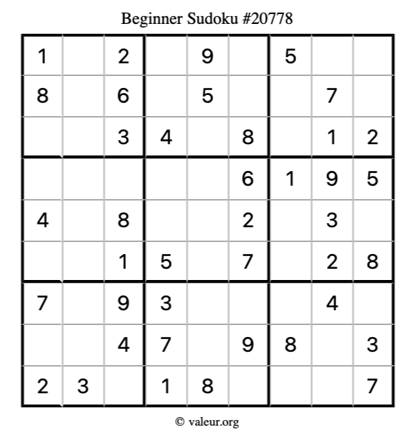 Here is our printable Beginner Sudoku Puzzle #20778. You are welcome to print a copy for yourself and solve it the old-fashioned way with a pencil and an eraser!