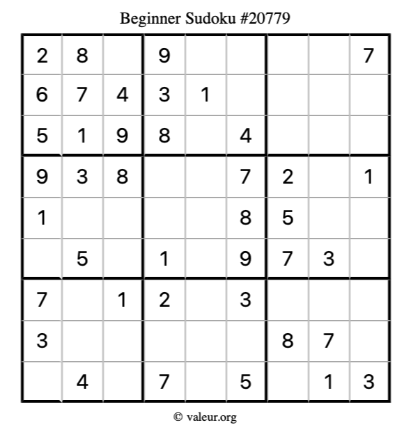 Here is our printable Beginner Sudoku Puzzle #20779. You are welcome to print a copy for yourself and solve it the old-fashioned way with a pencil and an eraser!