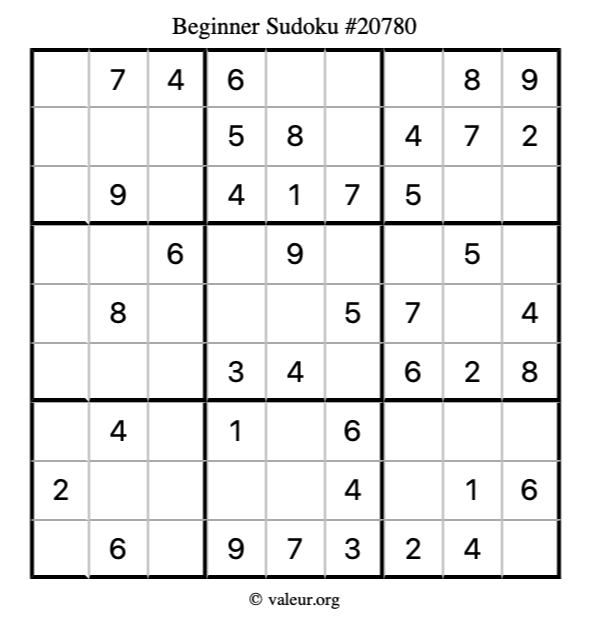 Here is our printable Beginner Sudoku Puzzle #20780. You are welcome to print a copy for yourself and solve it the old-fashioned way with a pencil and an eraser!