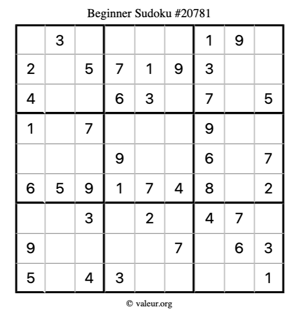 Here is our printable Beginner Sudoku Puzzle #20781. You are welcome to print a copy for yourself and solve it the old-fashioned way with a pencil and an eraser!