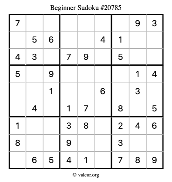 Here is our printable Beginner Sudoku Puzzle #20785. You are welcome to print a copy for yourself and solve it the old-fashioned way with a pencil and an eraser!