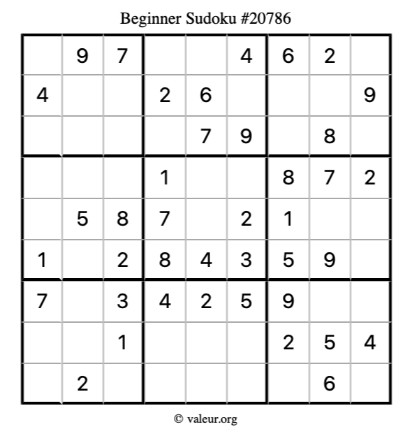 Here is our printable Beginner Sudoku Puzzle #20786. You are welcome to print a copy for yourself and solve it the old-fashioned way with a pencil and an eraser!