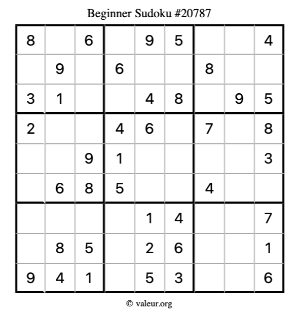 Here is our printable Beginner Sudoku Puzzle #20787. You are welcome to print a copy for yourself and solve it the old-fashioned way with a pencil and an eraser!