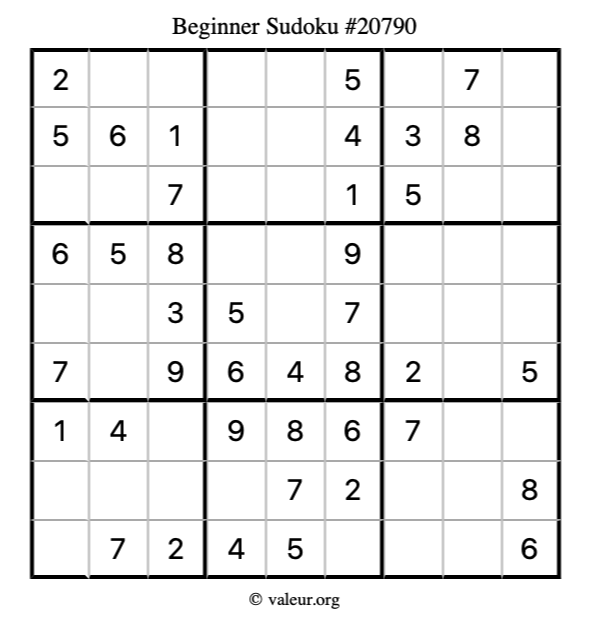Here is our printable Beginner Sudoku Puzzle #20790. You are welcome to print a copy for yourself and solve it the old-fashioned way with a pencil and an eraser!