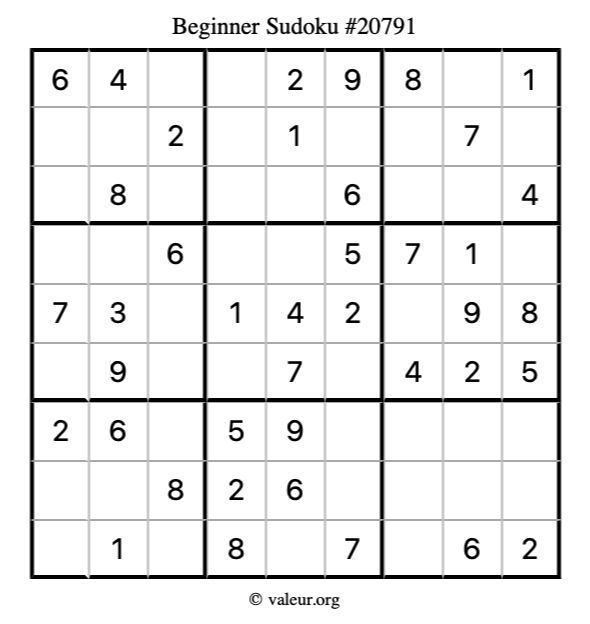 Here is our printable Beginner Sudoku Puzzle #20791. You are welcome to print a copy for yourself and solve it the old-fashioned way with a pencil and an eraser!