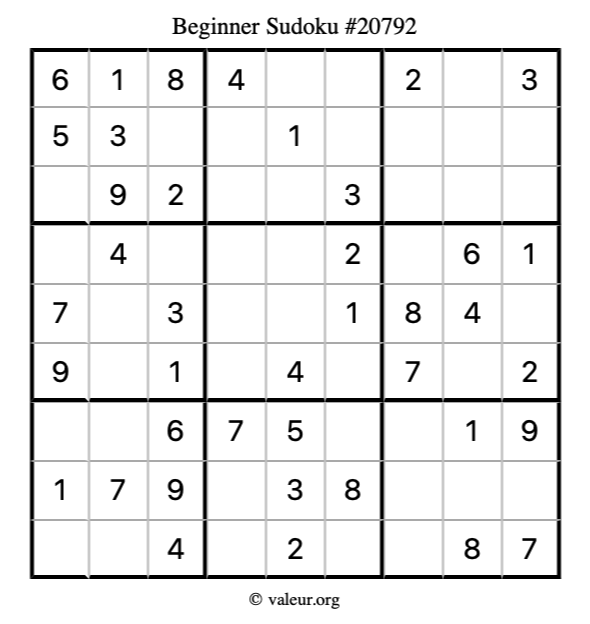 Here is our printable Beginner Sudoku Puzzle #20792. You are welcome to print a copy for yourself and solve it the old-fashioned way with a pencil and an eraser!