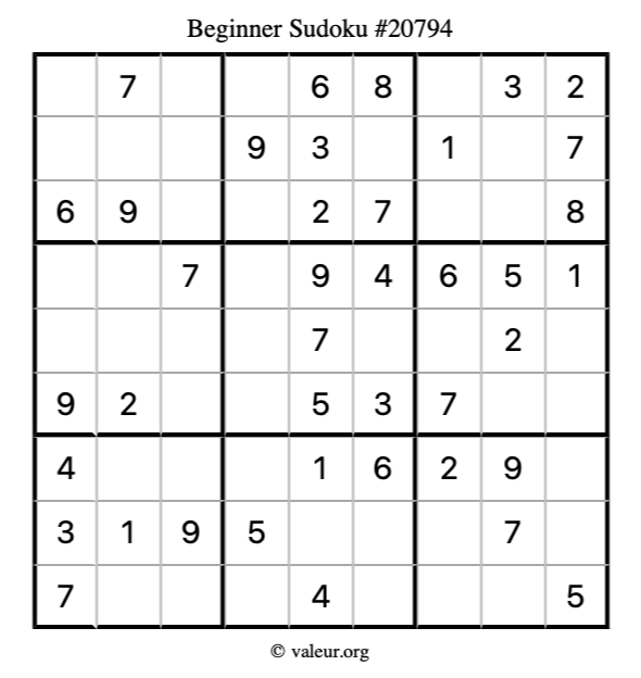 Here is our printable Beginner Sudoku Puzzle #20794. You are welcome to print a copy for yourself and solve it the old-fashioned way with a pencil and an eraser!