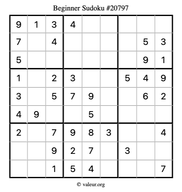 Here is our printable Beginner Sudoku Puzzle #20797. You are welcome to print a copy for yourself and solve it the old-fashioned way with a pencil and an eraser!