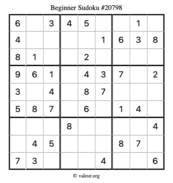 Here is our printable Beginner Sudoku Puzzle #20798. You are welcome to print a copy for yourself and solve it the old-fashioned way with a pencil and an eraser!