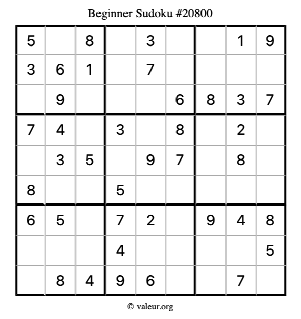Here is our printable Beginner Sudoku Puzzle #20800. You are welcome to print a copy for yourself and solve it the old-fashioned way with a pencil and an eraser!