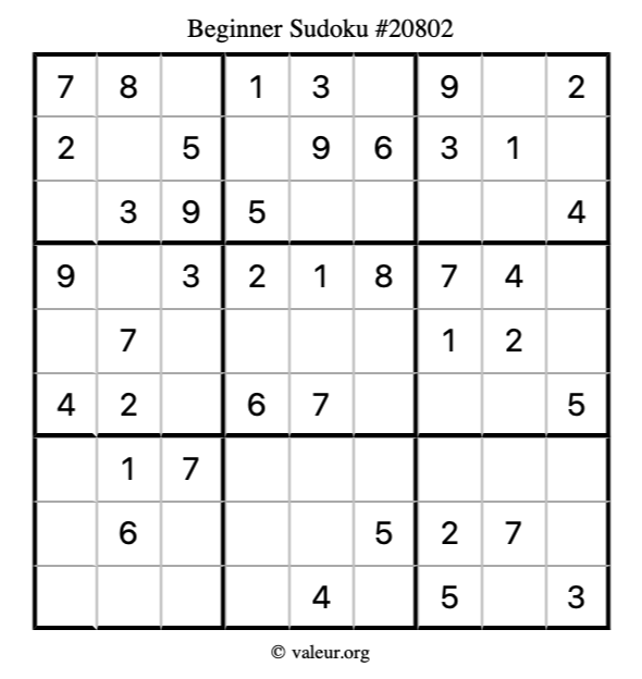 Here is our printable Beginner Sudoku Puzzle #20802. You are welcome to print a copy for yourself and solve it the old-fashioned way with a pencil and an eraser!