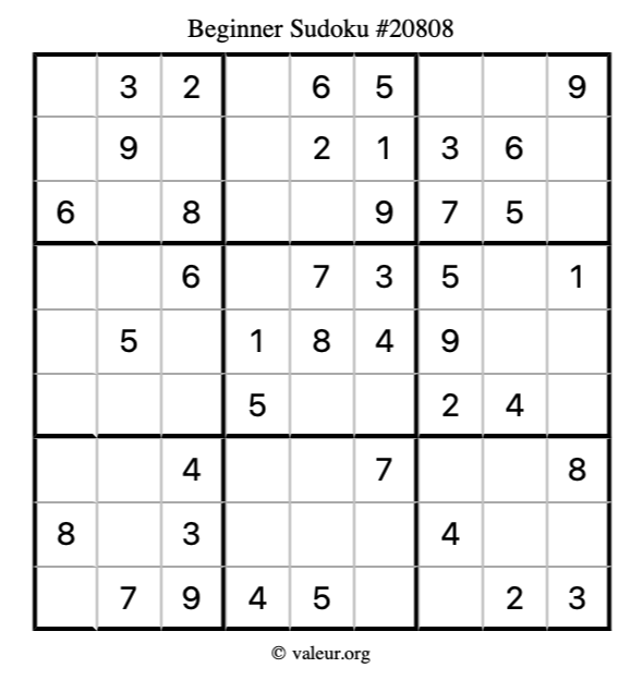 Here is our printable Beginner Sudoku Puzzle #20808. You are welcome to print a copy for yourself and solve it the old-fashioned way with a pencil and an eraser!