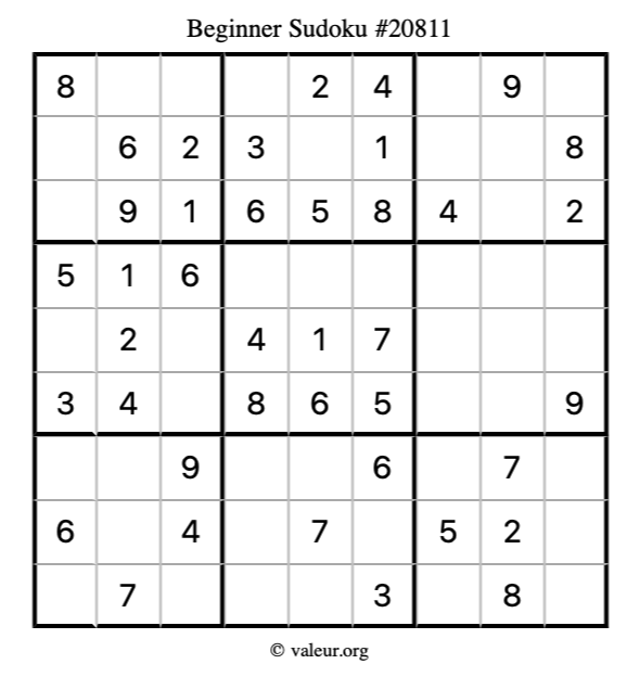 Here is our printable Beginner Sudoku Puzzle #20811. You are welcome to print a copy for yourself and solve it the old-fashioned way with a pencil and an eraser!