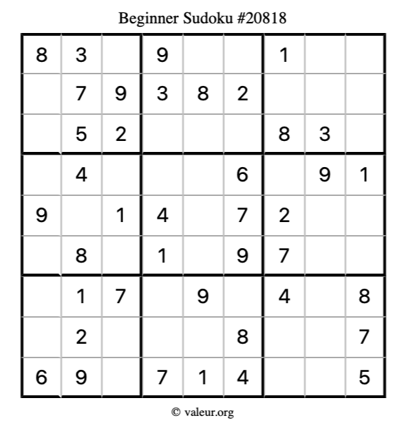 Here is our printable Beginner Sudoku Puzzle #20818. You are welcome to print a copy for yourself and solve it the old-fashioned way with a pencil and an eraser!