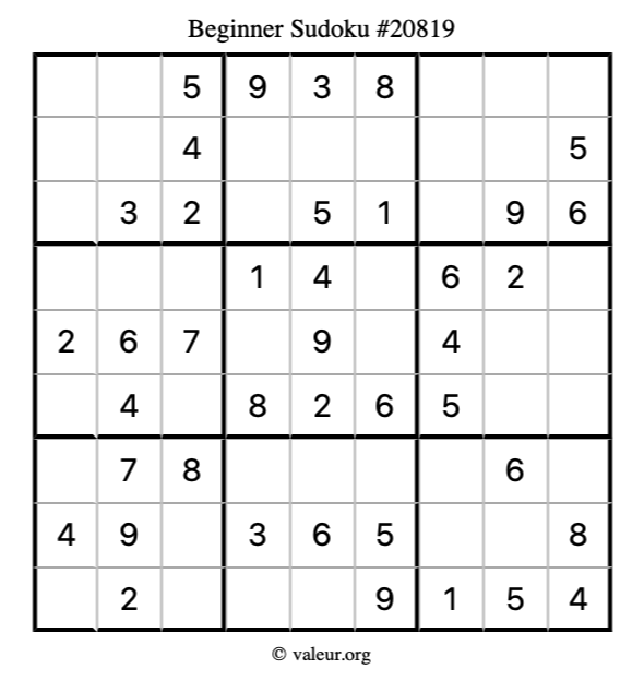 Here is our printable Beginner Sudoku Puzzle #20819. You are welcome to print a copy for yourself and solve it the old-fashioned way with a pencil and an eraser!
