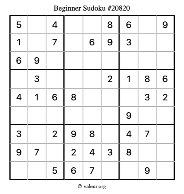 Here is our printable Beginner Sudoku Puzzle #20820. You are welcome to print a copy for yourself and solve it the old-fashioned way with a pencil and an eraser!