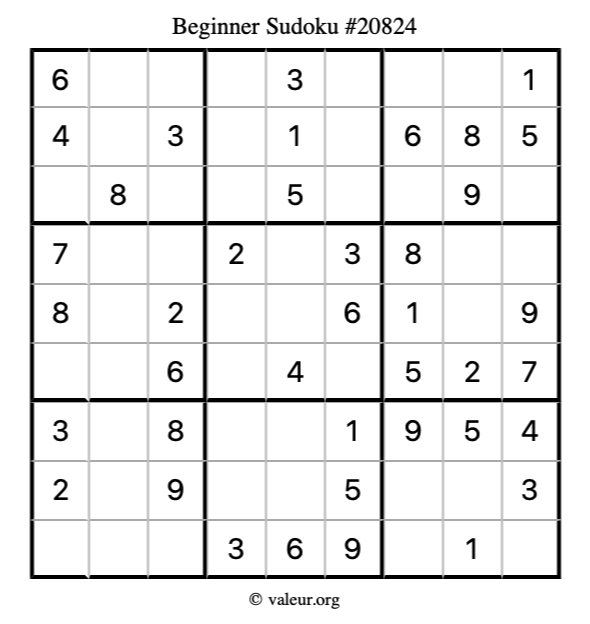 Here is our printable Beginner Sudoku Puzzle #20824. You are welcome to print a copy for yourself and solve it the old-fashioned way with a pencil and an eraser!
