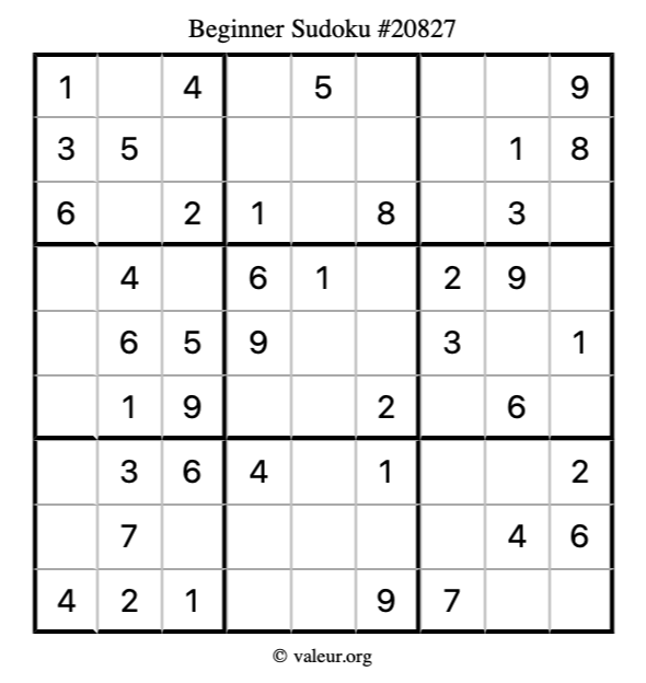Here is our printable Beginner Sudoku Puzzle #20827. You are welcome to print a copy for yourself and solve it the old-fashioned way with a pencil and an eraser!