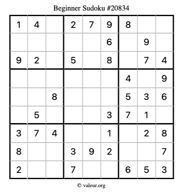 Here is our printable Beginner Sudoku Puzzle #20834. You are welcome to print a copy for yourself and solve it the old-fashioned way with a pencil and an eraser!