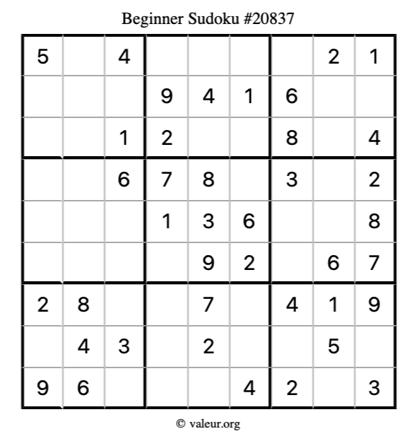 Here is our printable Beginner Sudoku Puzzle #20837. You are welcome to print a copy for yourself and solve it the old-fashioned way with a pencil and an eraser!