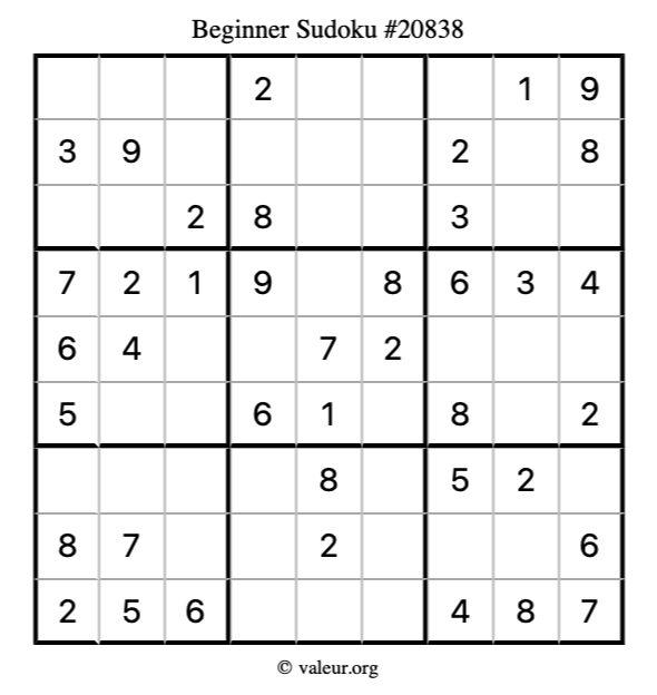 Here is our printable Beginner Sudoku Puzzle #20838. You are welcome to print a copy for yourself and solve it the old-fashioned way with a pencil and an eraser!