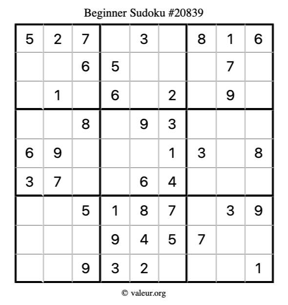 Here is our printable Beginner Sudoku Puzzle #20839. You are welcome to print a copy for yourself and solve it the old-fashioned way with a pencil and an eraser!