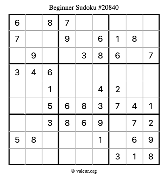 Here is our printable Beginner Sudoku Puzzle #20840. You are welcome to print a copy for yourself and solve it the old-fashioned way with a pencil and an eraser!
