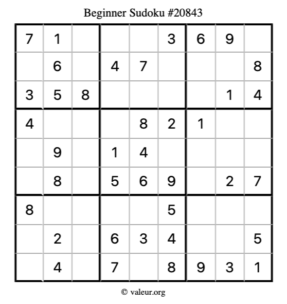 Here is our printable Beginner Sudoku Puzzle #20843. You are welcome to print a copy for yourself and solve it the old-fashioned way with a pencil and an eraser!