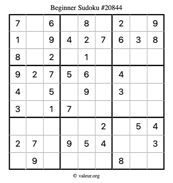 Here is our printable Beginner Sudoku Puzzle #20844. You are welcome to print a copy for yourself and solve it the old-fashioned way with a pencil and an eraser!