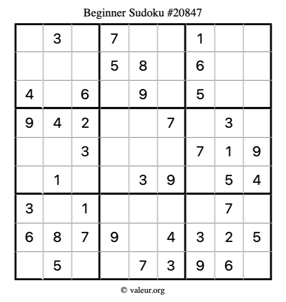 Here is our printable Beginner Sudoku Puzzle #20847. You are welcome to print a copy for yourself and solve it the old-fashioned way with a pencil and an eraser!
