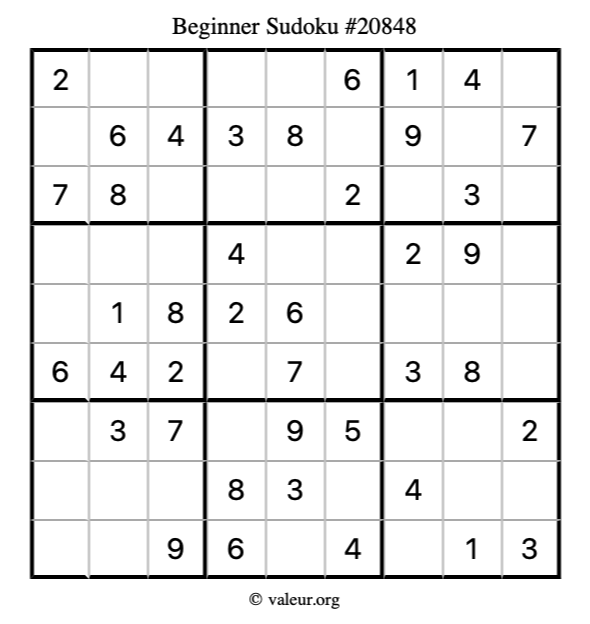 Here is our printable Beginner Sudoku Puzzle #20848. You are welcome to print a copy for yourself and solve it the old-fashioned way with a pencil and an eraser!