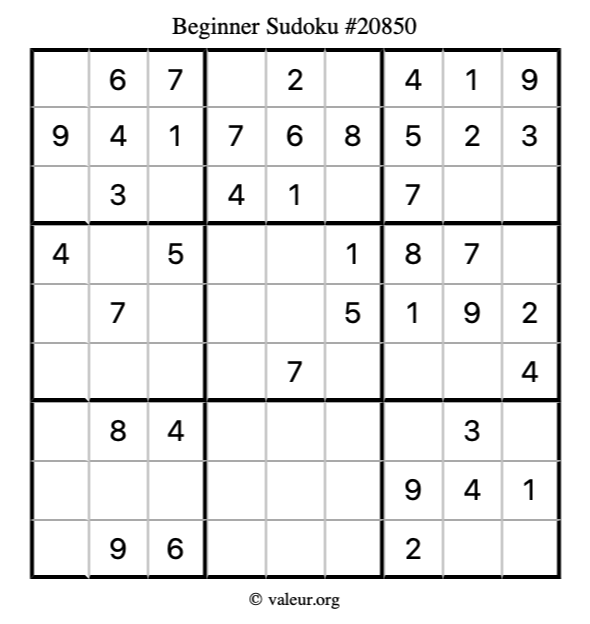 Here is our printable Beginner Sudoku Puzzle #20850. You are welcome to print a copy for yourself and solve it the old-fashioned way with a pencil and an eraser!