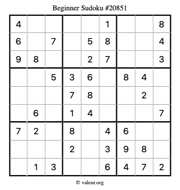 Here is our printable Beginner Sudoku Puzzle #20851. You are welcome to print a copy for yourself and solve it the old-fashioned way with a pencil and an eraser!
