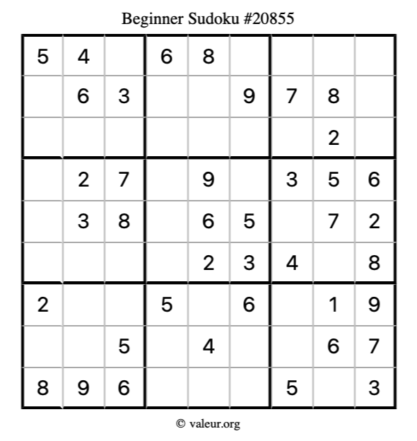 Here is our printable Beginner Sudoku Puzzle #20855. You are welcome to print a copy for yourself and solve it the old-fashioned way with a pencil and an eraser!