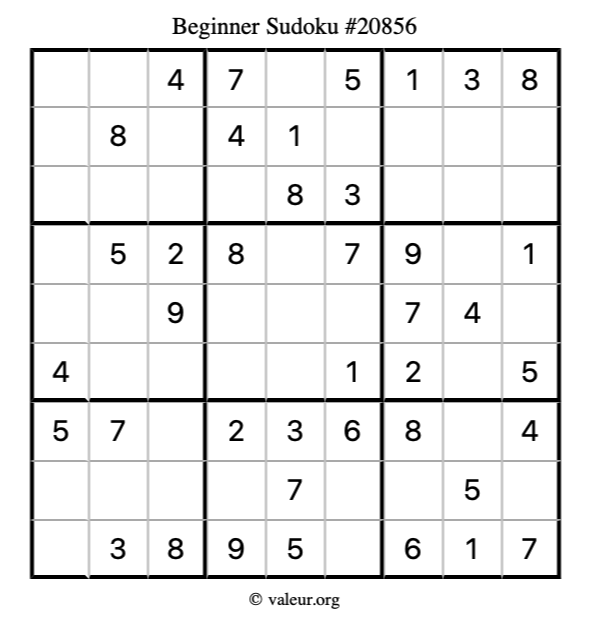 Here is our printable Beginner Sudoku Puzzle #20856. You are welcome to print a copy for yourself and solve it the old-fashioned way with a pencil and an eraser!