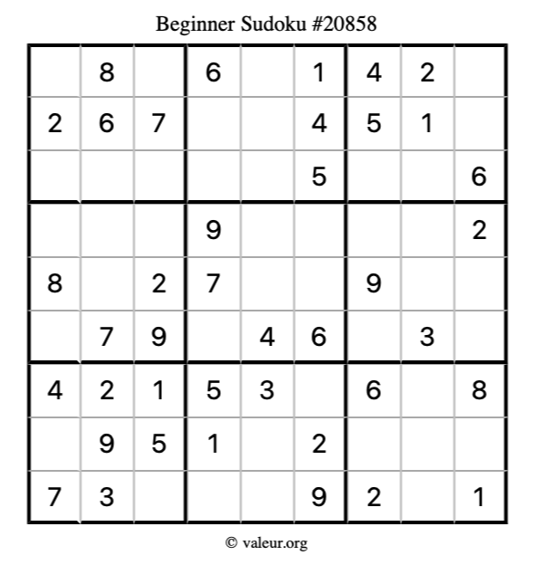 Here is our printable Beginner Sudoku Puzzle #20858. You are welcome to print a copy for yourself and solve it the old-fashioned way with a pencil and an eraser!