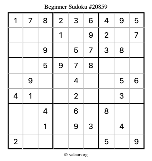 Here is our printable Beginner Sudoku Puzzle #20859. You are welcome to print a copy for yourself and solve it the old-fashioned way with a pencil and an eraser!