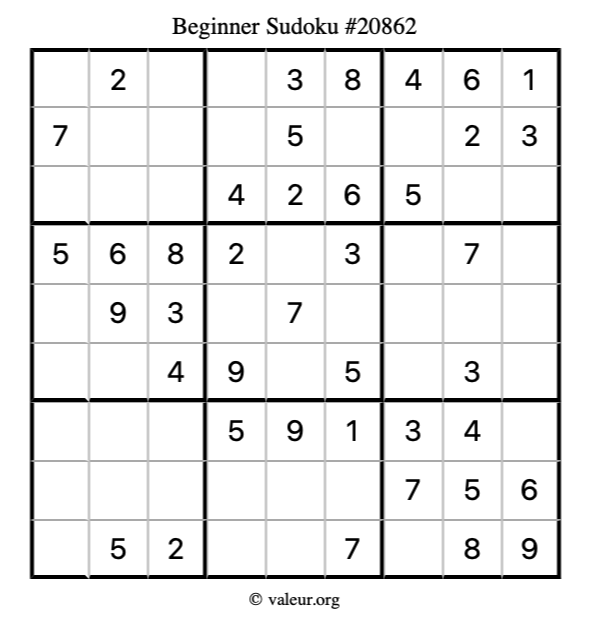 Here is our printable Beginner Sudoku Puzzle #20862. You are welcome to print a copy for yourself and solve it the old-fashioned way with a pencil and an eraser!