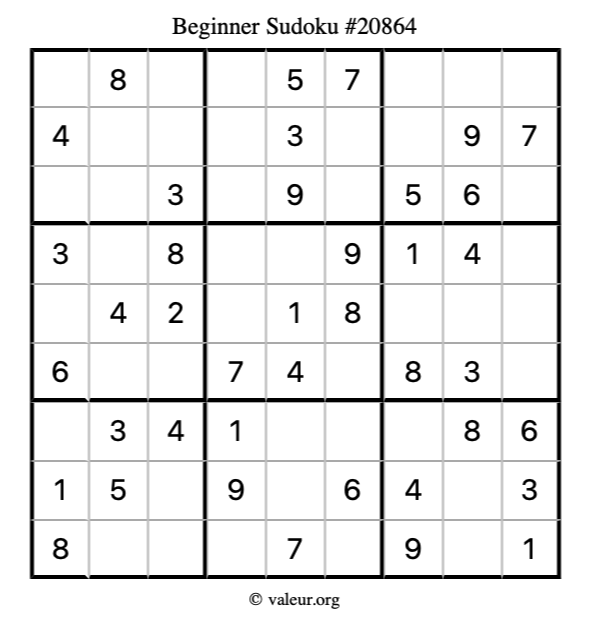 Here is our printable Beginner Sudoku Puzzle #20864. You are welcome to print a copy for yourself and solve it the old-fashioned way with a pencil and an eraser!