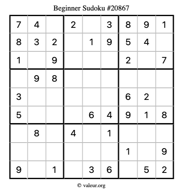 Here is our printable Beginner Sudoku Puzzle #20867. You are welcome to print a copy for yourself and solve it the old-fashioned way with a pencil and an eraser!