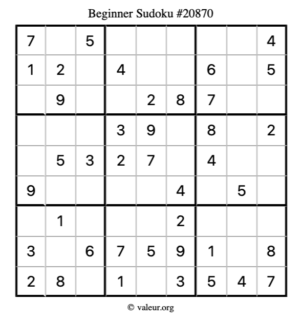 Here is our printable Beginner Sudoku Puzzle #20870. You are welcome to print a copy for yourself and solve it the old-fashioned way with a pencil and an eraser!