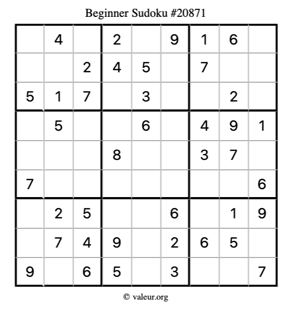 Here is our printable Beginner Sudoku Puzzle #20871. You are welcome to print a copy for yourself and solve it the old-fashioned way with a pencil and an eraser!