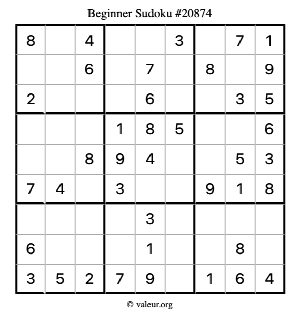 Here is our printable Beginner Sudoku Puzzle #20874. You are welcome to print a copy for yourself and solve it the old-fashioned way with a pencil and an eraser!